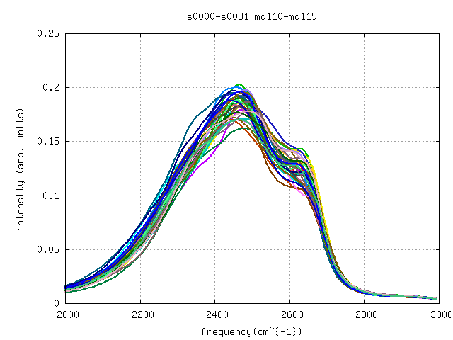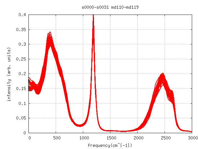 D2O power spectrum of atomic velocities (samples s0000-s0031, averaged over runs md110-md119).